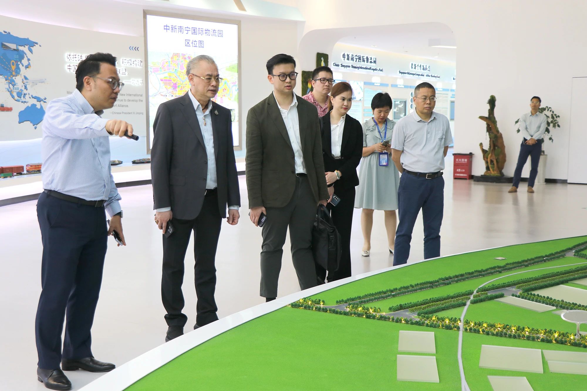 在中新物流園展示中心,考察團(tuán)一行深入了解項(xiàng)目的整體情況。作為國(guó)際陸海貿(mào)易新通道上重要的物流樞紐節(jié)點(diǎn)項(xiàng)目之一,園區(qū)堅(jiān)持以“強(qiáng)中選強(qiáng),優(yōu)中選優(yōu)”重點(diǎn)引進(jìn)大型物流龍頭企業(yè)為招商理念和工作方針,目前已引進(jìn)超30家世界500強(qiáng)和中國(guó)100強(qiáng)龍頭企業(yè)進(jìn)行合作,共同實(shí)施項(xiàng)目建設(shè)和運(yùn)營(yíng)。同時(shí),為能更好地?fù)屪CEP新發(fā)展機(jī)遇,中新物流園與時(shí)俱進(jìn)不斷創(chuàng)新,于2021年聯(lián)合中國(guó)—東盟博覽會(huì)秘書處共同打造了獨(dú)具特色的匯聚中心,通過線上數(shù)字化平臺(tái)+線下展館沉浸式商貿(mào)體驗(yàn)相結(jié)合的方式,致力于搭建一個(gè)中國(guó)與東盟、RCEP其他區(qū)域國(guó)家乃至“一帶一路”沿線重要國(guó)家線上線下經(jīng)貿(mào)往來(lái)的一站式首選平臺(tái)。