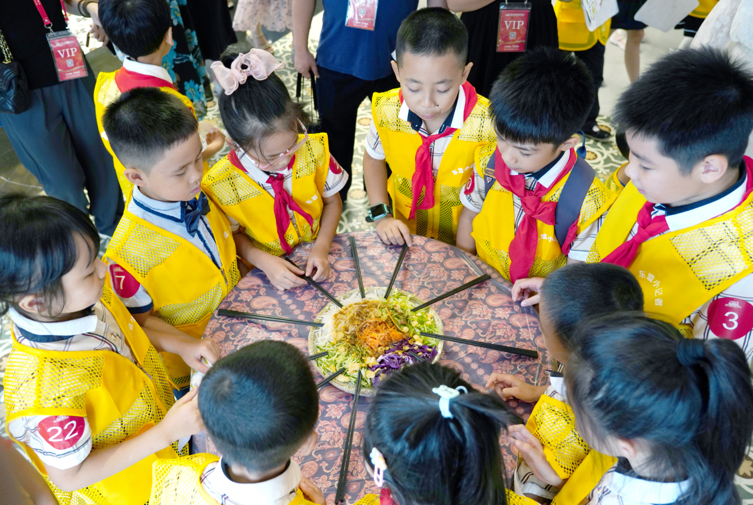 在馬來西亞館,東盟“小記者”們?cè)诂F(xiàn)場(chǎng)親身體驗(yàn)了地道的東南亞華人傳統(tǒng)習(xí)俗——“撈生”儀式,即把裝在盤子里的食材用筷子反復(fù)高高夾起,“撈”得越高,寓意越吉祥。通過趣味“撈生”,寄語孩子們學(xué)習(xí)更上一層樓、德智體美勞全面發(fā)展的美好愿望。
