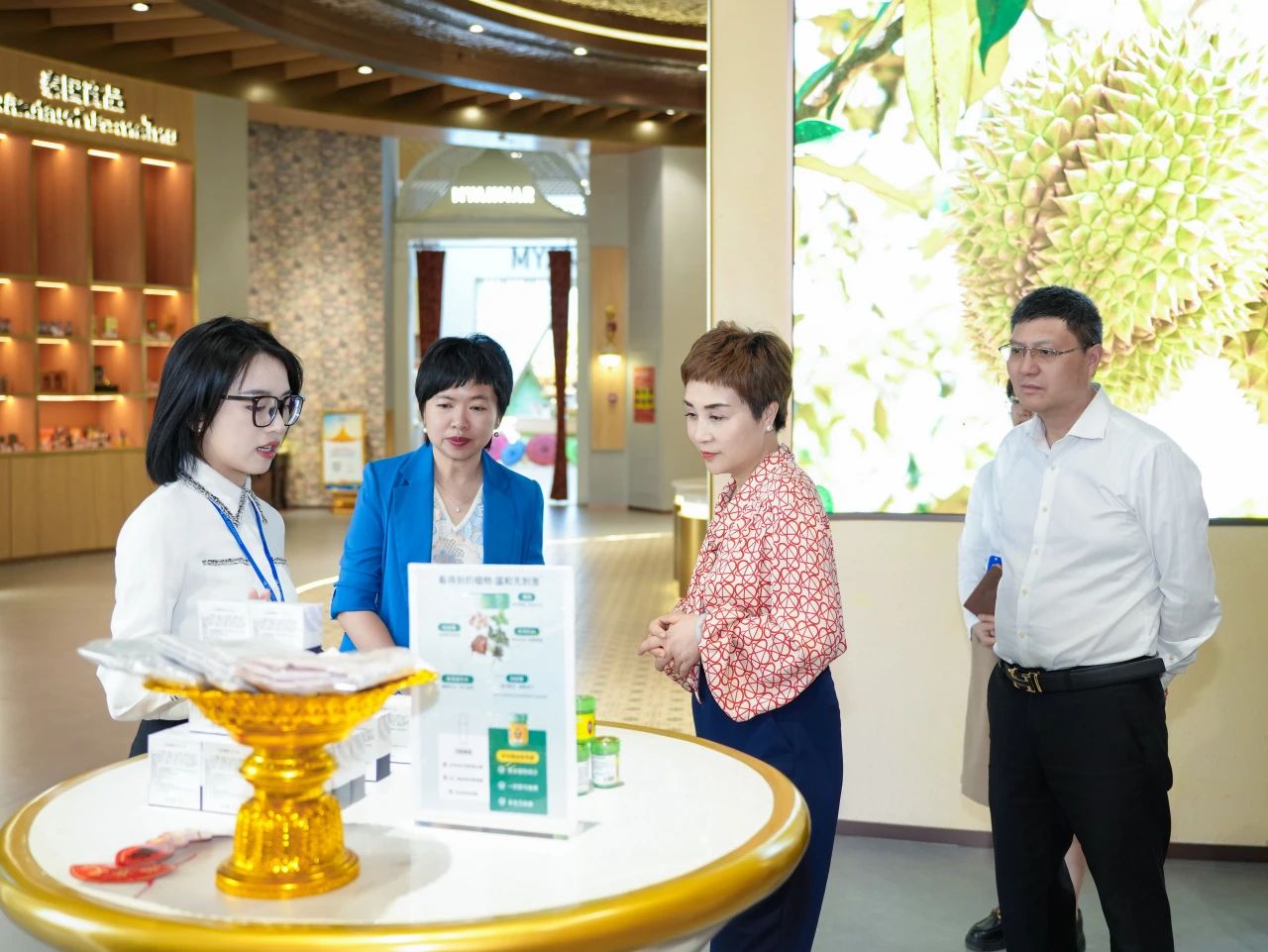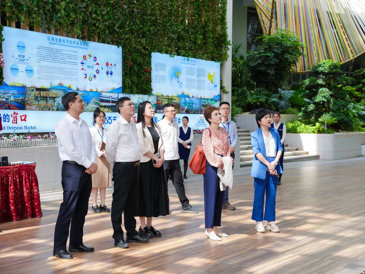 在匯聚中心參觀各主題展館的過(guò)程中,調(diào)研組詳細(xì)了解項(xiàng)目如何通過(guò)以“物”引“流”、以“物”促“流”的方式,搭建中國(guó)與東盟、RCEP其他區(qū)域國(guó)家乃至“一帶一路”沿線重要國(guó)家經(jīng)貿(mào)往來(lái)線上線下B2B、B2C一站式首選平臺(tái),成為外國(guó)商家進(jìn)入中國(guó)市場(chǎng)的首站,以及中國(guó)商家拓展海外市場(chǎng)的窗口。
